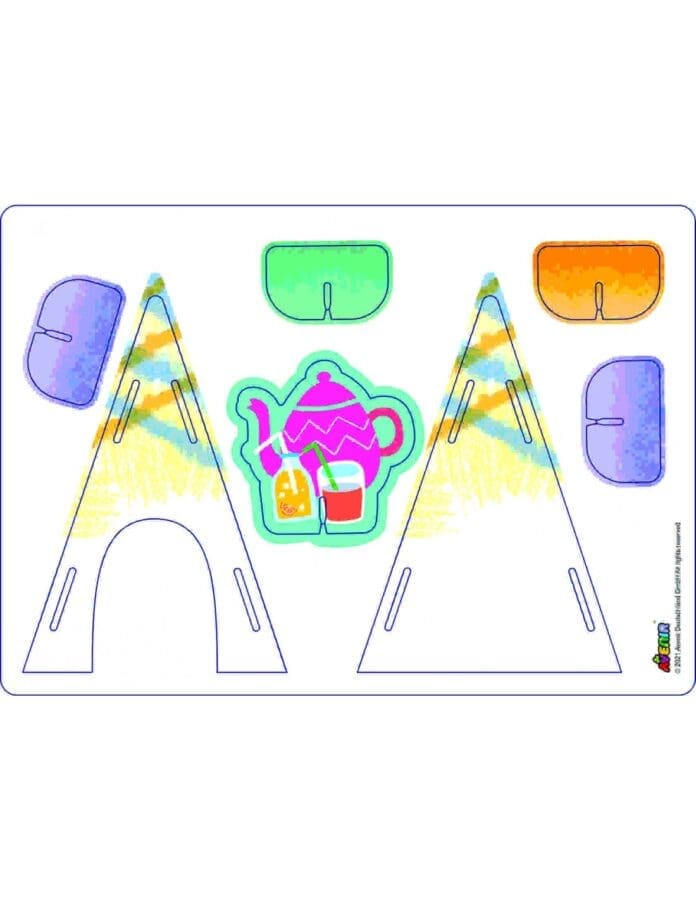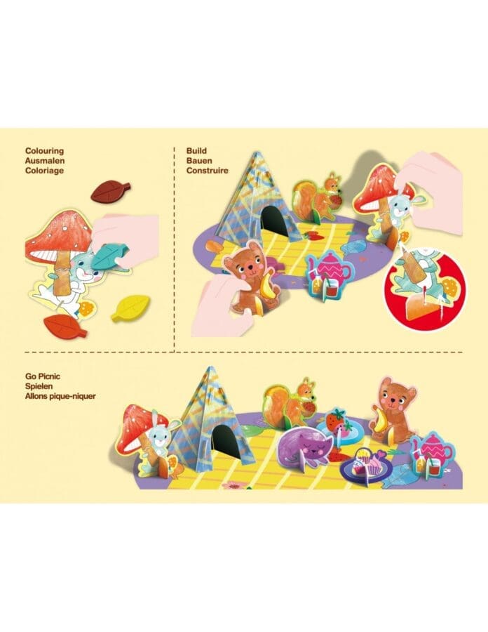 Η συσκευασία περιλαμβάνει 12 διαφορετικές κηρομπογιές (από φυσικό κερί μέλισσας) για απολαυστική ζωγραφική και χρωματισμό των έτοιμων εικόνων. Το παιχνίδι μπορεί να συνεχιστεί με την κατασκευή του σκηνικού, τοποθετώντας τα αγαπημένα ζωάκια πάνω στη “μακέτα”, και να ολοκληρωθεί με παιχνίδι ρόλων.