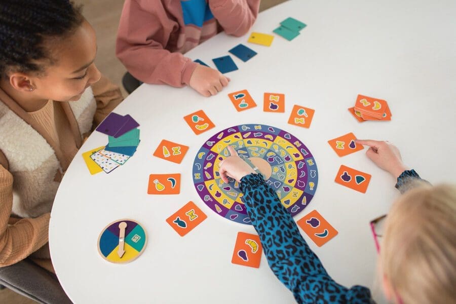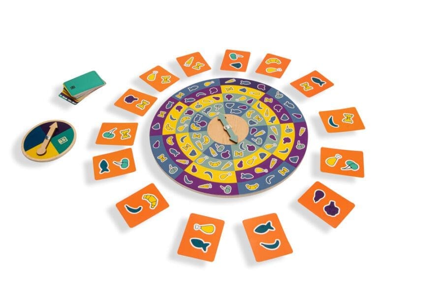 Bs Toys – Dinner Spinner – FSC 100%. Ένα παιχνίδια για γρήγορους! Τοποθέτησε τις 14 κάρτες γύρω από τον περιστροφέα και γύρνα τα βέλη και στις δύο πλευρές. Παρατήρησε τα αντικείμενα στα χρωματιστά πεδία που σου υποδεικνύουν τα βέλη και βρες όσο το δυνατόν πιο γρήγορα δύο εικόνες που να ταιριάζουν! Οι κάρτες έχουν έναν μοναδικό “χρωματιστό κωδικό” που σου δίνουν έξτρα πόντους.