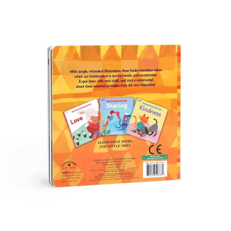 Με απλές εικόνες, γεμάτες έμπνευση, τα πρώτα βιβλία των μικρών από την Αμερικάνικη eeBoo, εισάγουν αξίες όπως η αγάπη, που είναι θεμελιώδεις για την οικογένεια, τους φίλους, και την κοινωνικοποίηση.
