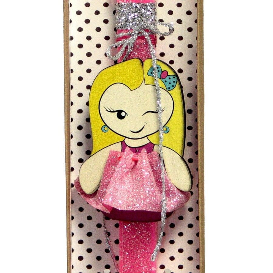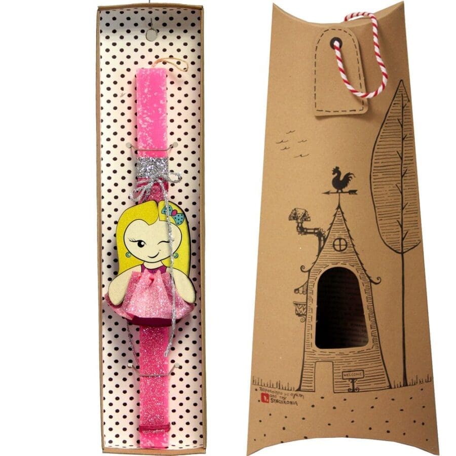 Διακοσμημένη με μια όμορφη κουκλίτσα. Το κερί είναι αρωματικό, χειροποίητο και κατασκευάζεται στην Ελλάδα. Τα υλικά διακόσμησης είναι υψηλής ποιότητας και εισάγονται αποκλειστικά από την SYNCHRONIA. Τα αντικείμενα σχεδιάζονται ή επιλέγονται όχι μόνο για την αισθητική αλλά και για την αυθεντικότητα, την φιλικότητα προς το περιβάλλον και το δίκαιο εμπόριο. Η βάση προβολής και το εξωτερικό κουτί δώρου περιλαμβάνονται. Ύψος λαμπάδας: 30εκ.