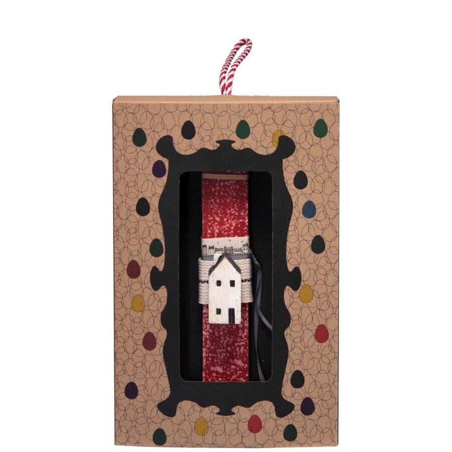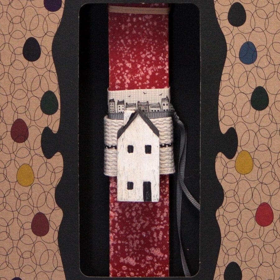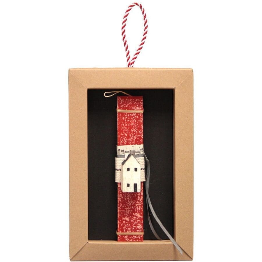 Διακοσμημένη με ένα ξύλινο χειροποίητο σπιτάκι. Το κερί είναι αρωματικό, χειροποίητο και κατασκευάζεται στην Ελλάδα. Τα υλικά διακόσμησης είναι υψηλής ποιότητας. Τα αντικείμενα σχεδιάζονται ή επιλέγονται όχι μόνο για την αισθητική αλλά και για την αυθεντικότητα, την φιλικότητα προς το περιβάλλον και το δίκαιο εμπόριο. Έρχεται σε συσκευασία δώρου. Ύψος λαμπάδας: 20εκ.