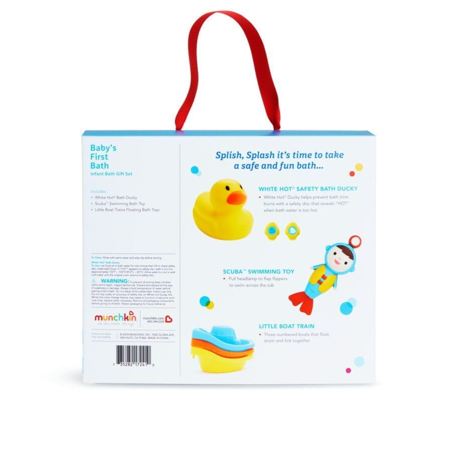 Μπορεί να είναι δύσκολο να υπολογίσετε σωστά τη θερμοκρασία του νερού για το μπάνιο του μωρού σας, αλλά με το θερμόμετρο White Hot Safety Bath Ducky τα εγκαύματα ανήκουν στο παρελθόν. Το κλασικό ελαστικό παπάκι διαθέτει έναν δίσκο στον οποίο εμφανίζεται η ένδειξη HOT όταν το νερό είναι ακατάλληλο για το ευαίσθητο δέρμα του μωρού σας. Επίσης, επιπλέει, δεν μουχλιάζει και είναι κατάλληλα σχεδιασμένο για βρεφικά χεράκια – ασφάλεια και διασκέδαση σε ένα. Βυθιστείτε στον μαγικό κόσμο του Scuba Swimming Bath Toy – λατρεμένο από βρέφη και παιδιά – και του Little Boat Train, που συνδέεται, στοιβάζεται, επιπλέει και χύνει νερό. Κάντε το μπάνιο την αγαπημένη στιγμή της ημέρας για όλους με παιχνίδια που θα κάνουν το μωρό σας να πλατσουρίζει από χαρά!