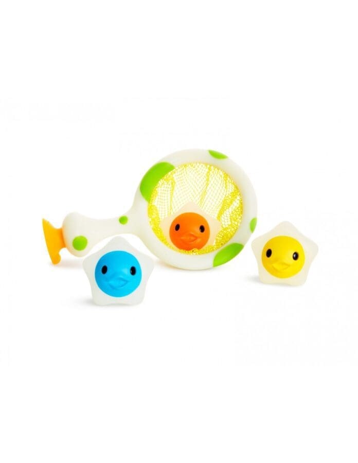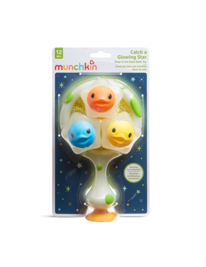 Τρία γλυκά, πλωτά αστέρια και μία απόχη με βεντούζα θα δώσουν λάμψη στη σκοτεινή μπανιέρα σας, χαρίζοντας ατελείωτες ώρες παιχνιδιού! Μόλις εκτεθούν στο φως, τα αστέρια και το στεφάνι της απόχης φωτίζονται. Το μικρό σας μπορεί να αξιοποιήσει τη λάμψη αυτή για να μαζέψει με το δίχτυ τα πλωτά αστέρια ή να παίξει μπάσκετ την ώρα του μπάνιου, απλά βεντουζώνοντας την απόχη στον τοίχο!