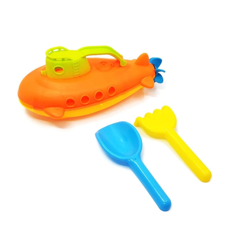 Επιβιβαστείτε στο υποβρύχιο και φύγαμε για ονειρεμένα ταξίδια! Το όμορφο αυτό σετ περιλαμβάνει φτυαράκι και τσουγκράνα για να μπορεί το παιδί να απολαμβάνει το παιχνίδι στην άμμο. Ιδανικό και για την ώρα του μπάνιου στο σπίτι! To υποβρύχιο καθαρίζεται εύκολα στο χέρι ή στο πλυντήριο πιάτων. Η περιστρεφόμενη προπέλα που βρίσκεται στο πίσω μέρος του και ο επίπεδος πάτος του χαρίζουν σταθερότητα, ενώ η λαβή του το καθιστά εύκολο στη μεταφορά. Κατάλληλο για ηλικίες 3 ετών και άνω. Διαστάσεις Συσκευασίας: 26.5 x 14 x 11 εκ.