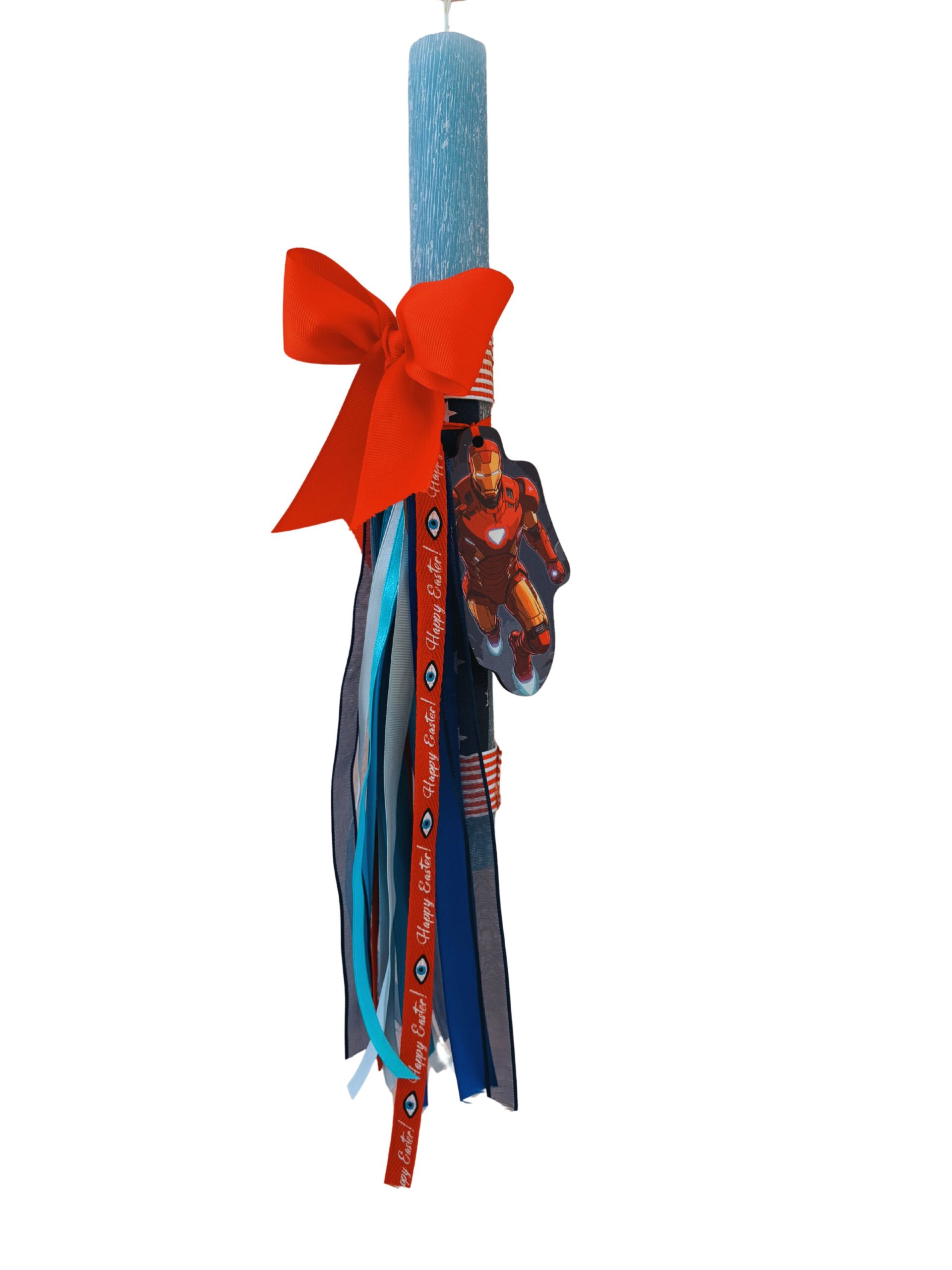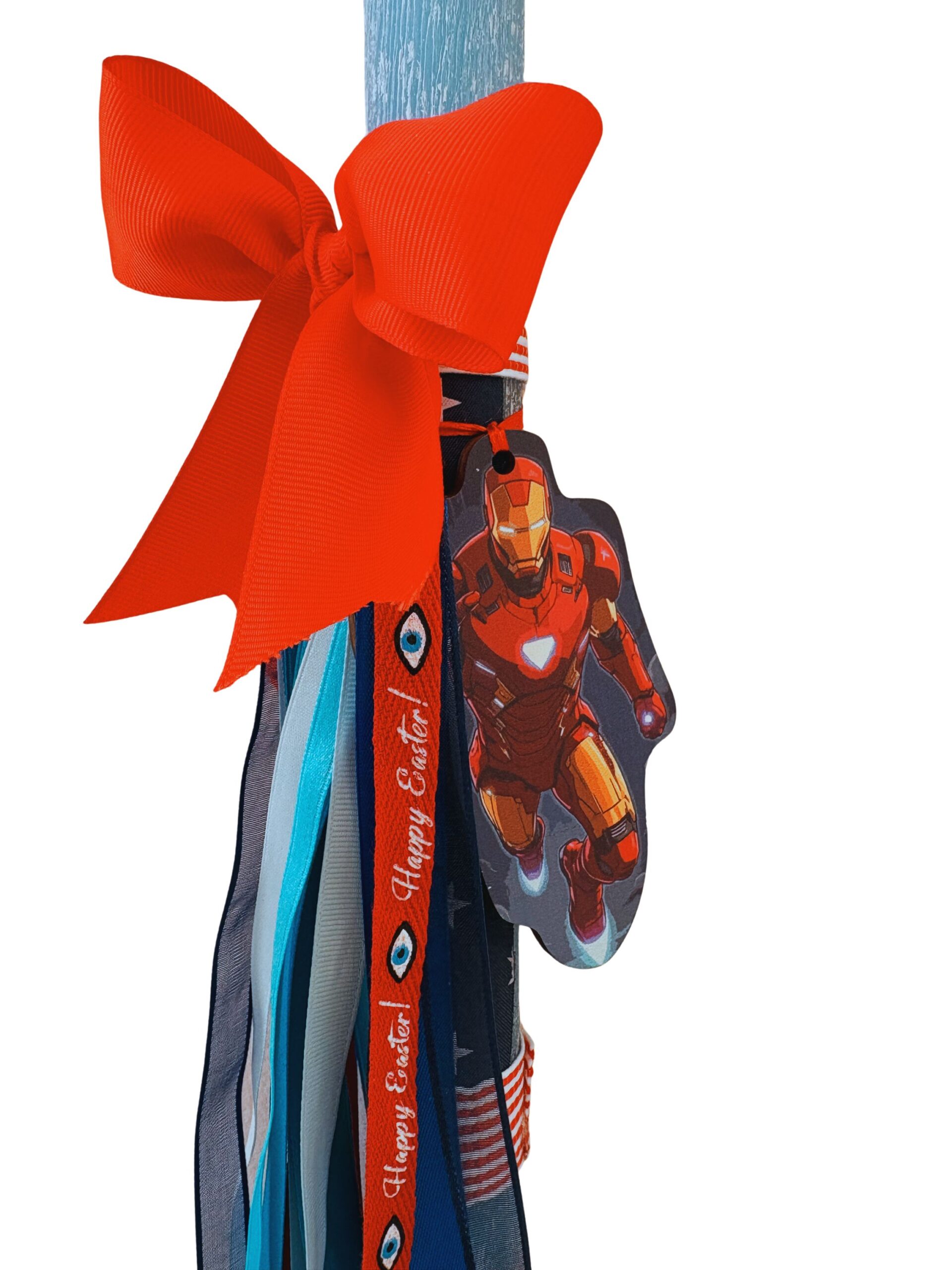 Χειροποίητη πασχαλινή λαμπάδα με θέμα τον Iron-Man, ιδανική για μικρούς και μεγάλους φίλους των υπερηρώων.