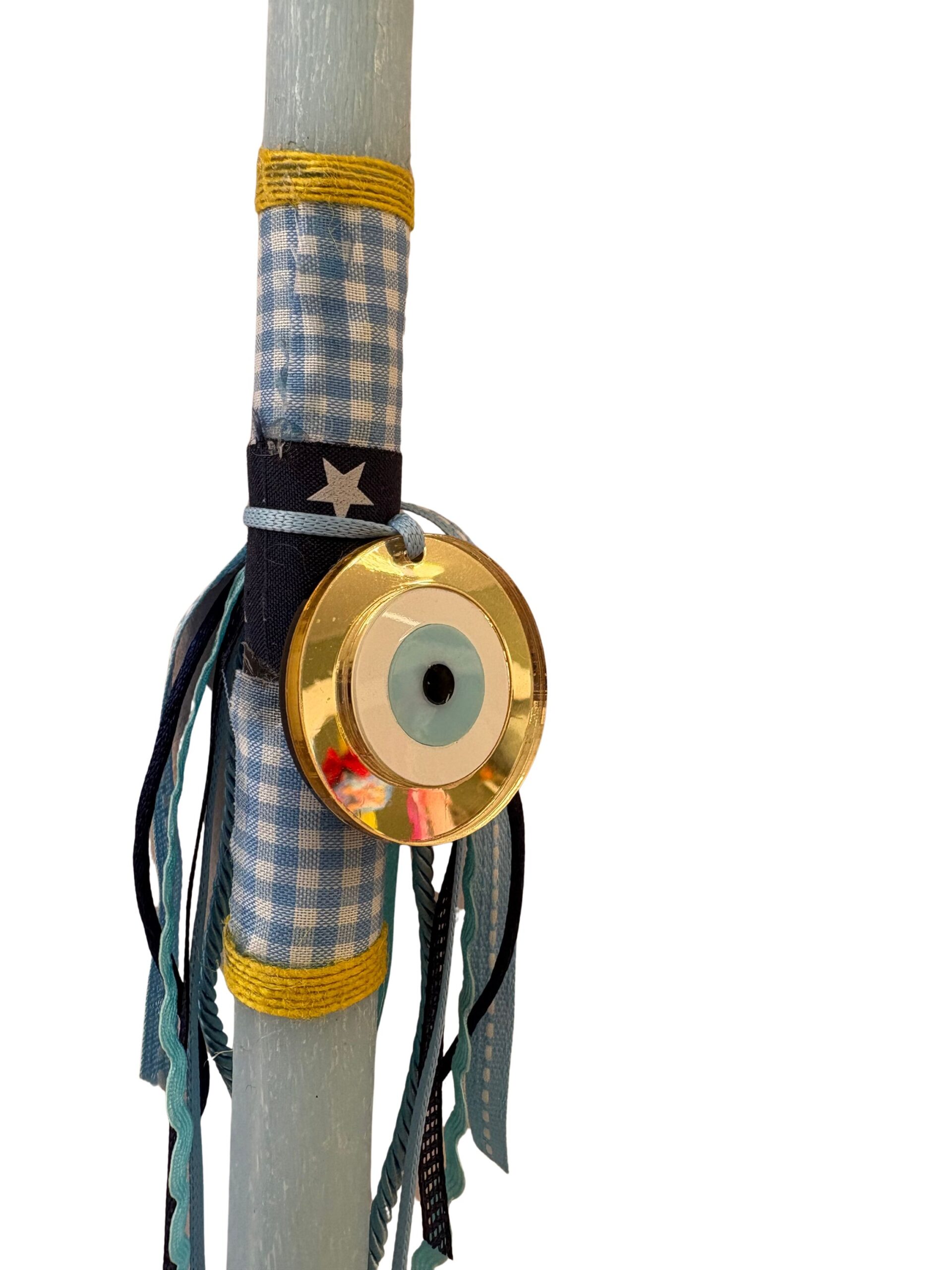 Μοναδική πασχαλινή λαμπάδα διακοσμημένη με το σύμβολο του ματιού για προστασία από το κακό μάτι. Ιδανικό δώρο για αγαπημένα πρόσωπα με παράδοση και θετική ενέργεια.