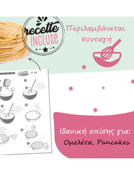 Εκτός από κρέπες μπορείτε να ψήσετε ομελέτες, pancakes (τηγανίτες), cinnamon roles, ινδικά πιτάκια naan, κλπ χάρη στην αντικολλήτικη επίστρωση που διαθέτει και με τα 3 καλούπια που περιλαμβάνονται να δημιουργήσετε χαρούμενα σχέδια για τους αγαπημένους σας.