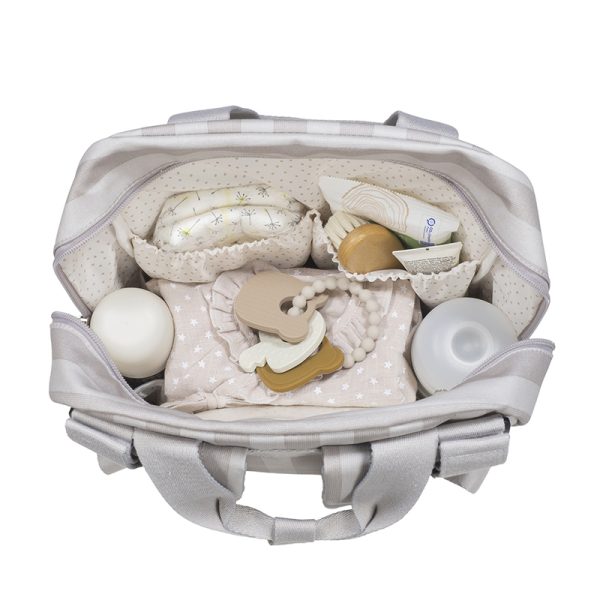 Ελαφρύ και ανθεκτικό με μεγάλη χωρητικότητα για να μεταφέρετε όλα όσα χρειάζεστε εσείς και το μωρό σας. Το σχήμα του προσφέρει πολλές εξωτερικές και εσωτερικές τσέπες για να κρατάτε τα πάντα οργανωμένα και διαθέσιμα. Διαθέτει τσέπες για να αποθηκεύετε μπουκάλια και να τα διατηρείτε ασφαλή. Περιλαμβάνει μία αλλαξιέρα και μια τσέπη για να αποθηκεύετε βρεγμένα ρούχα και να απομονώνετε την υγρασία από το υπόλοιπο σακίδιο. Η τσάντα περιλαμβάνει 2 ρυθμιζόμενες κοντές λαβές που διευκολύνουν την τοποθέτηση σε οποιοδήποτε μοντέλο καροτσιού, χειρολαβές και ιμάντες με επένδυση για να κρέμονται από τους ώμους μέχρι την πλάτη, χωρίς να προκαλείται ενόχληση λόγω του βάρους. Εξαιρετική ποιότητα και πολύ κομψό. Κατασκευασμένο από ανθεκτικό και εύκολο στο καθάρισμα υλικό.
